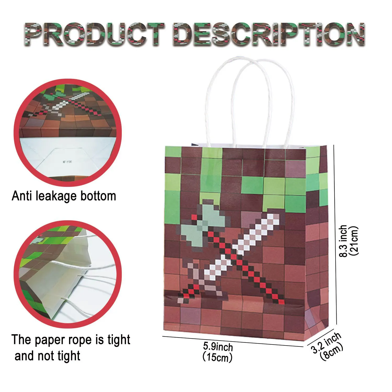 Прочная, долговечная и большая емкость: изготовленная из высококачественной утолщенной крафт-бумаги, эта сумка с пиксельным рисунком не только имеет изысканный дизайн, но и предлагает отличную несущую способность и долговечность. Он может легко хранить различные небольшие подарки, не подвергая их повреждениям.